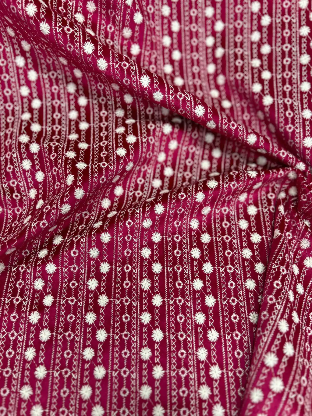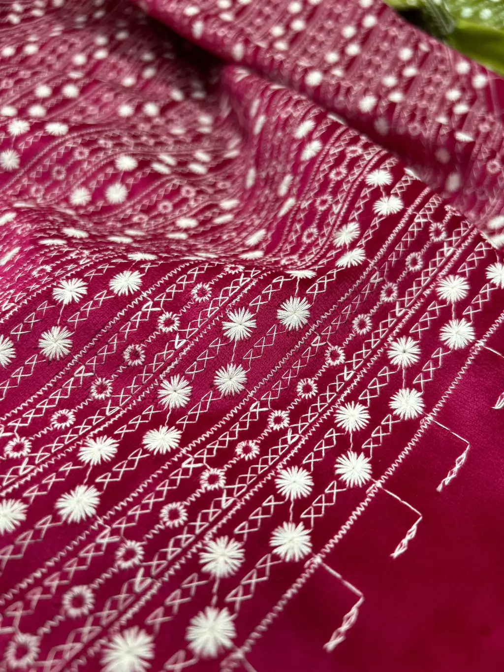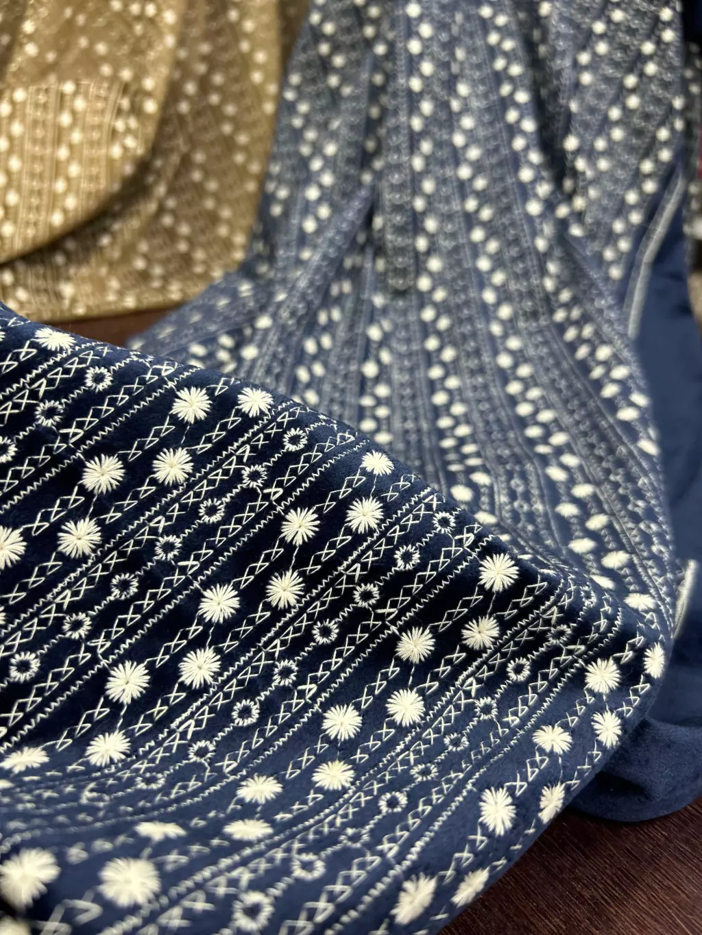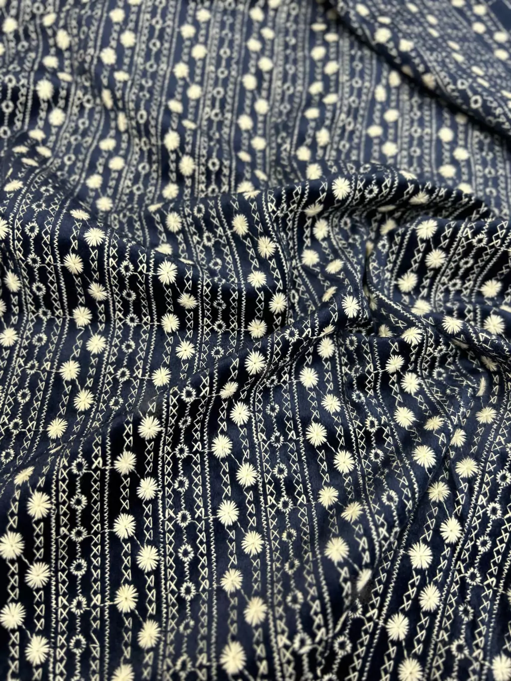 Com uma gramatura de 310g/m², este tecido oferece um caimento perfeito, unindo o toque macio do veludo com a delicadeza dos bordados. Perfeito para criar peças elegantes e confortáveis, como blazers, vestidos e saias que exigem um toque de luxo e estilo.